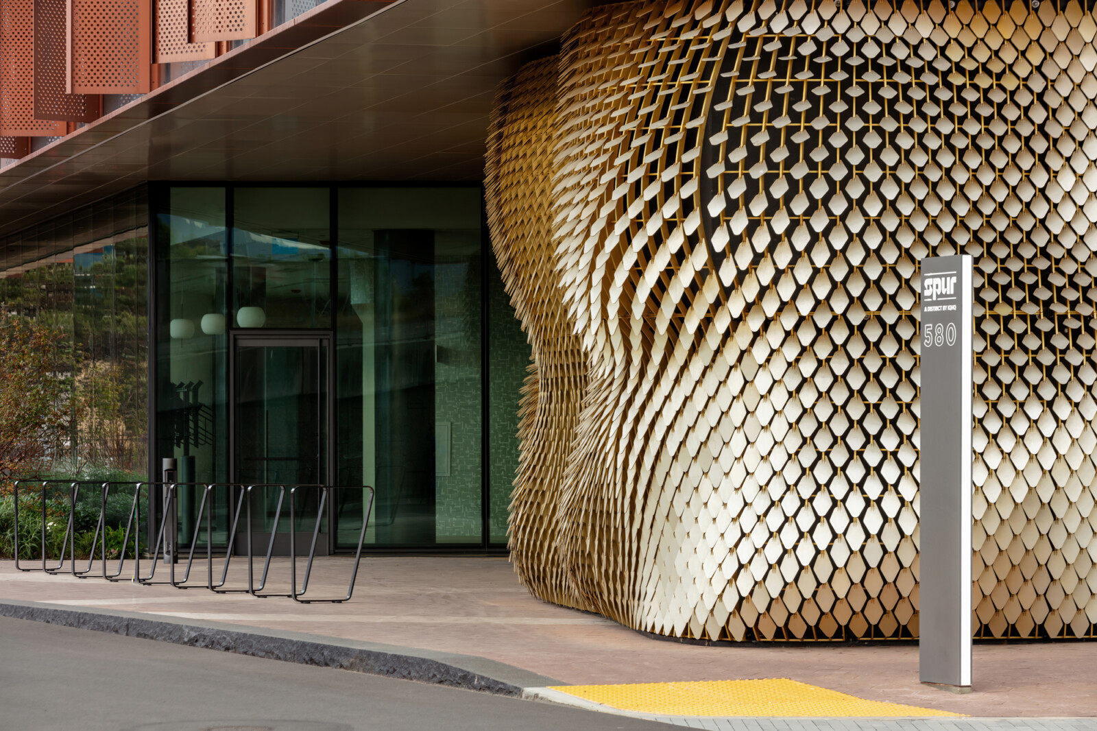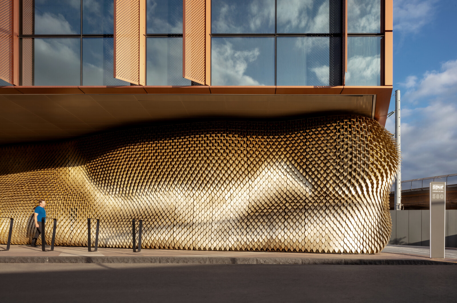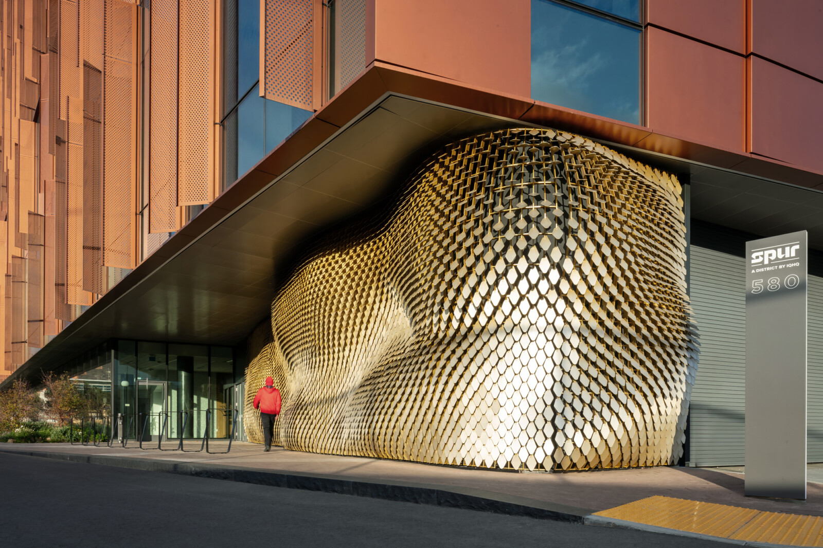 A sculptural wave unfurls across the new Spur district building, offering a fleeting moment of wonder within the rhythm of the commute.