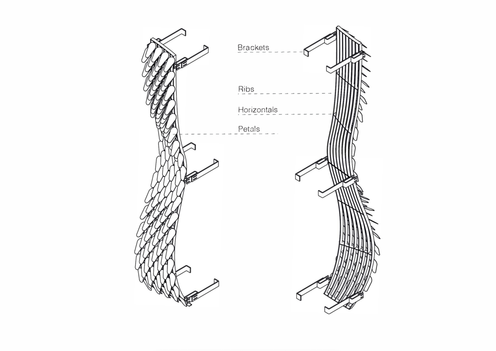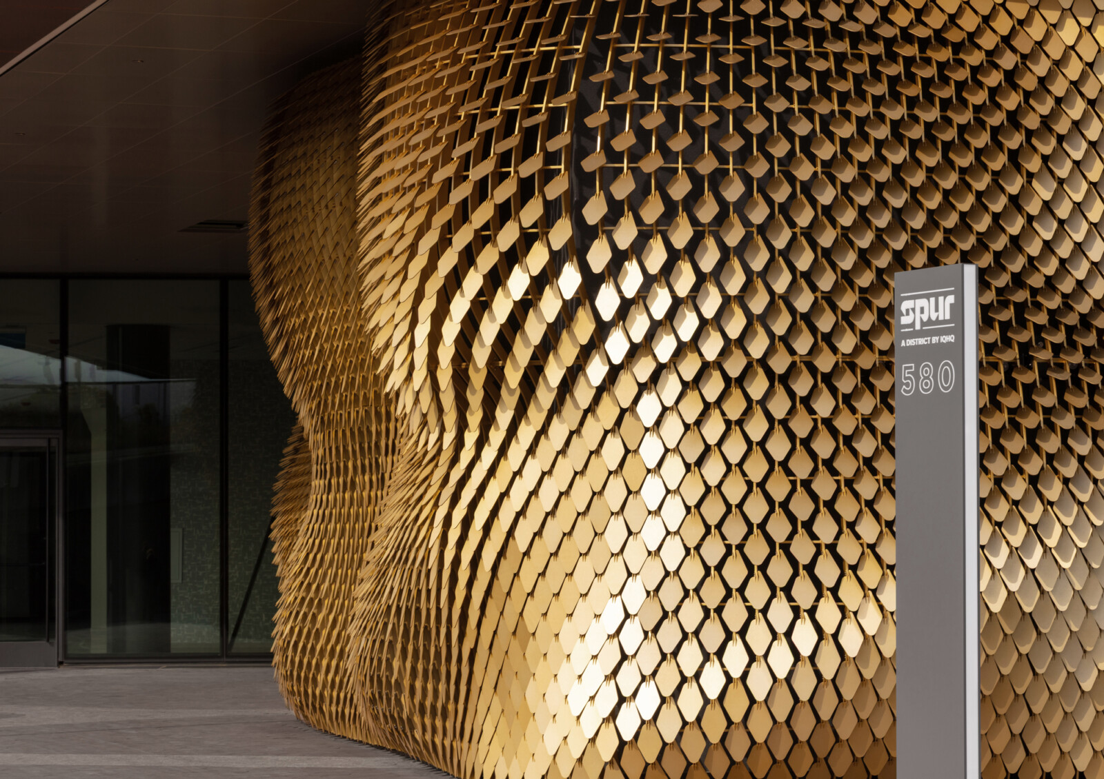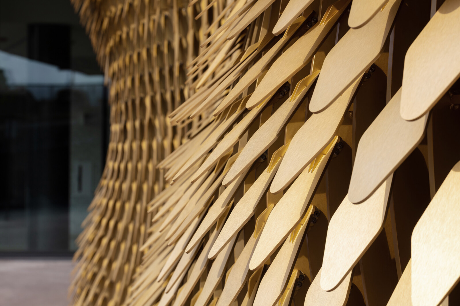 Formed of thousands of aluminium petals, it cascades across the building’s corner like a metallic wave, catching light and shifting with each passing moment.