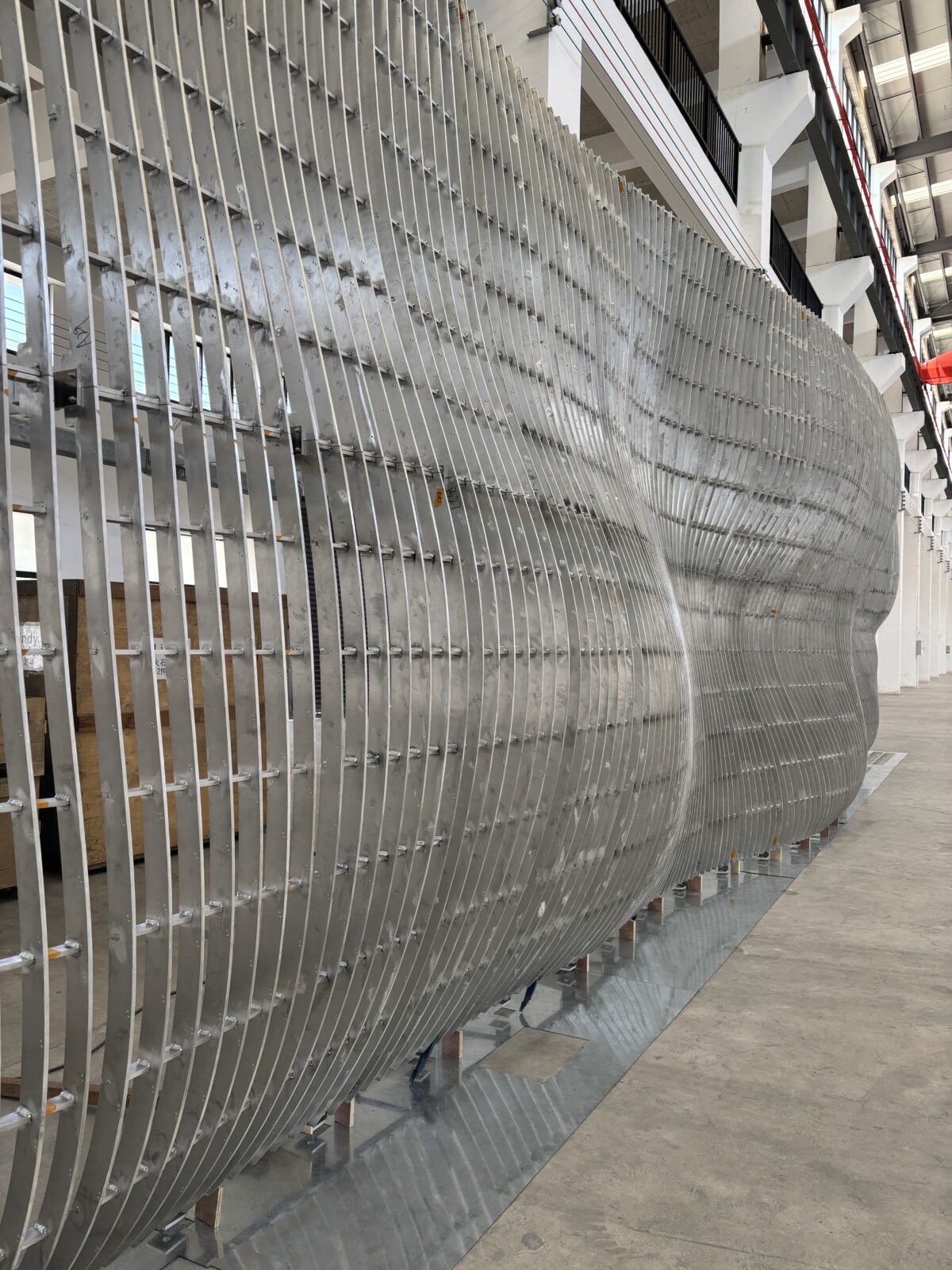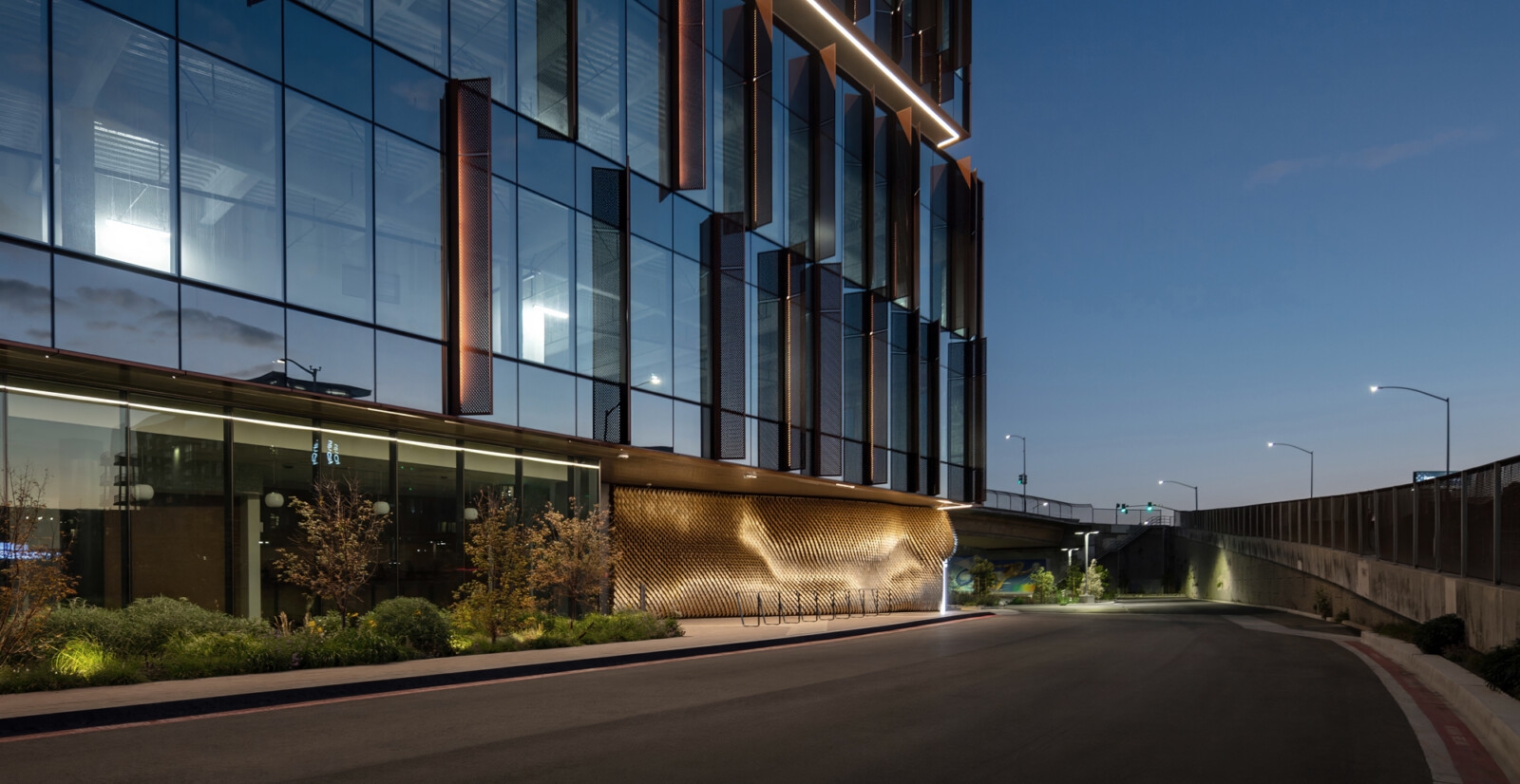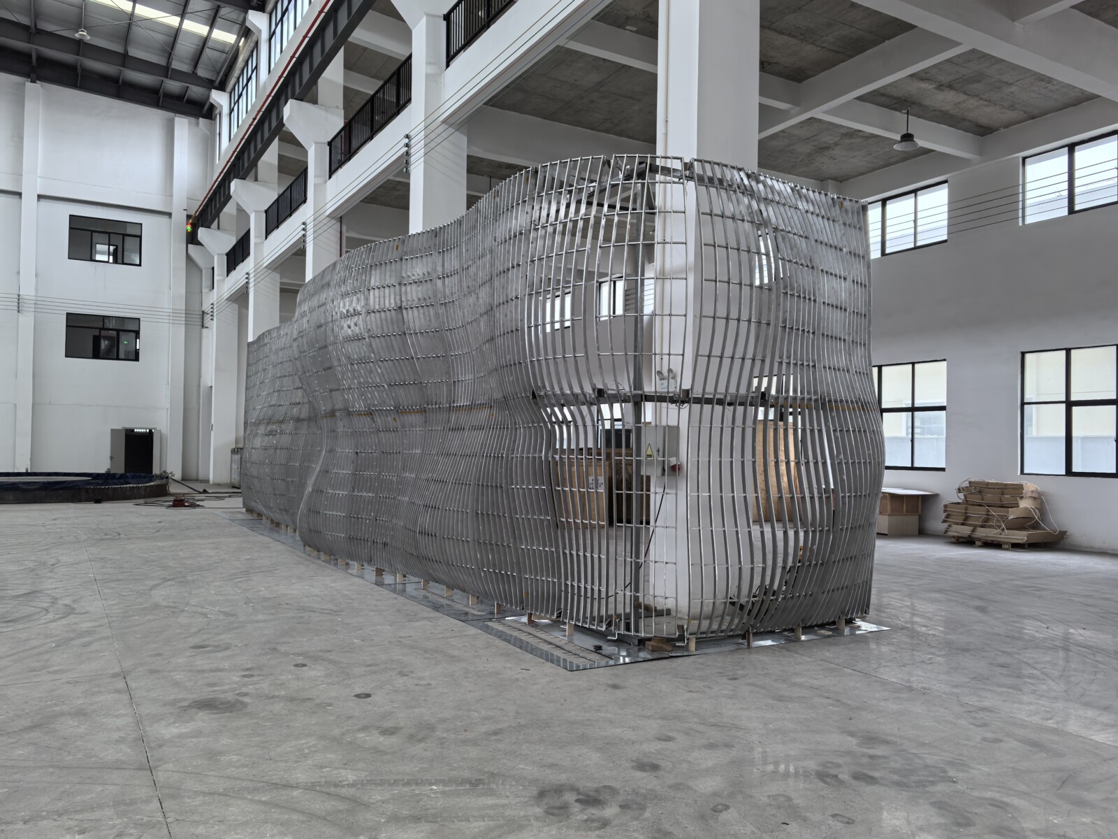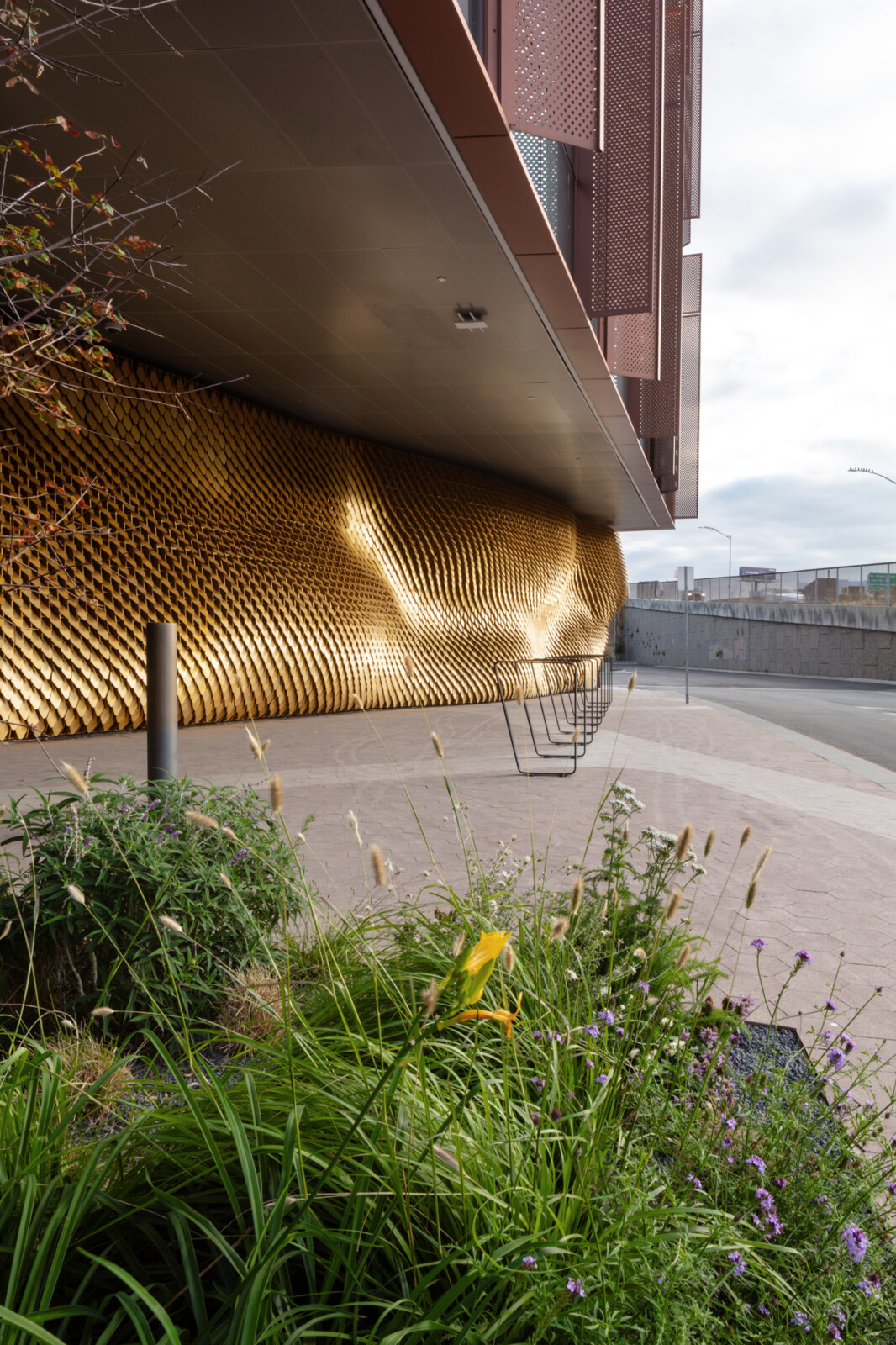 Formed of thousands of aluminium petals, it cascades across the building’s corner like a metallic wave, catching light and shifting with each passing moment.